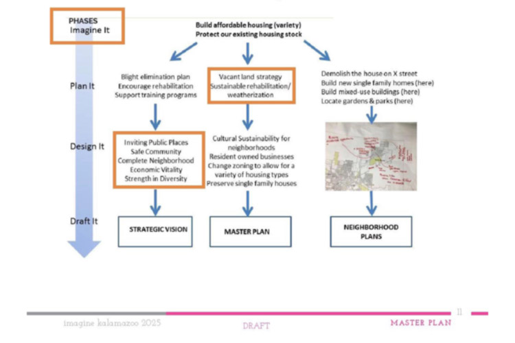 Initial ideas and discussion led to a strategic vision with a number of themes. Next, to shape goals, planners asked the community about specific desires for the identified themes. Goals led to designs, each time checking with the neighborhoods most directly affected by the developing plans. Each phase of Imagine Kalamazoo 2025 focused the input, leading to more detailed information, and the development of specific actions. The result is that the plans developed out of Imagine Kalamazoo 2025 all relate to one another.