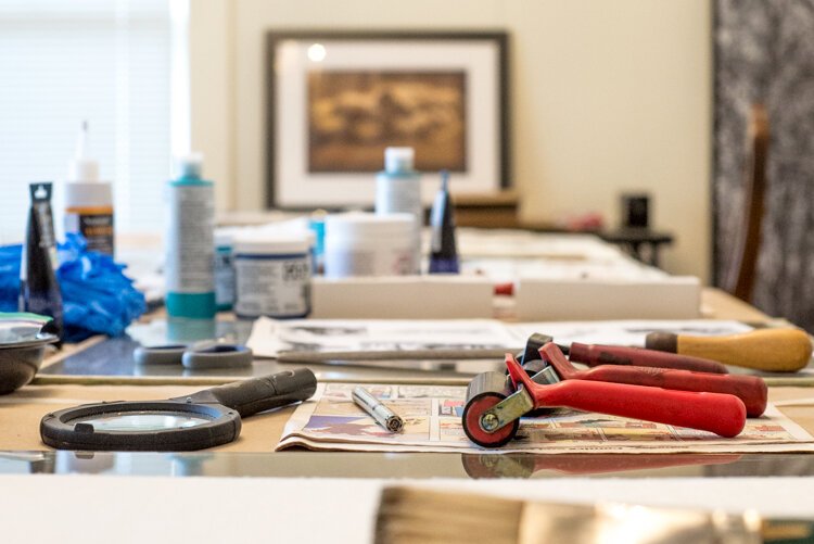 Her husband, who Rzoska says can do “just about anything,” removed the drop ceilings, refinished the original molding, added a tin ceiling to the kitchen, re-did the bathrooms, installed ceiling medallions and added many artistic touches to the house consistent with its original character. The end result is a three-story home with a first-floor office area, currently rented by Holy Cross Children Services, a second-floor gallery and workshop area, and third-floor studio.