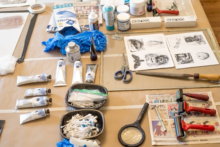 So far, the group includes drawers, painters, jewelry and fiber artists, sculptors, and two poets, who all participate in what has turned out to be a productive, inspiring collaborative, Rzoska says. The group includes poets Kerlikowske and Lynn Pattison and artists Michael Dunn, Maryellen Hains, David Stokes, Randy Walker, Anna Ill, Vicki VanAmeyden, Tamara Hirzel, Dave Middleton, Alexa Karabin, Joe Smigiel, Justin Bernhardt, and Susan Badger, among others who have joined more recently.
