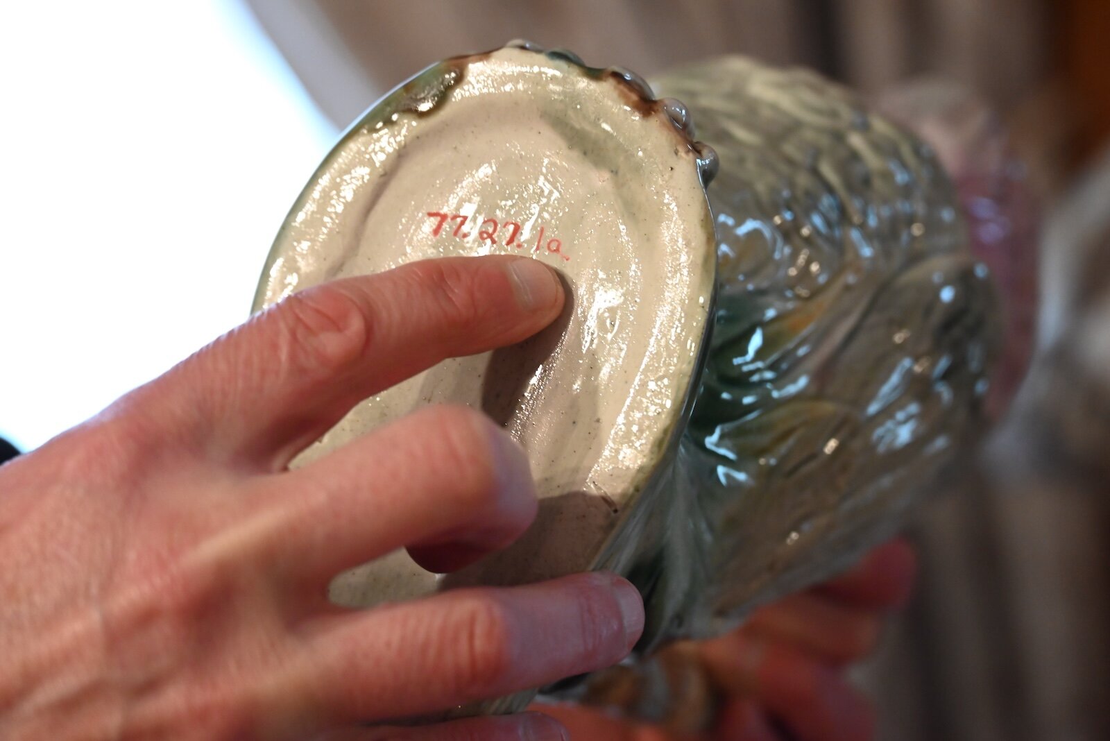 Ray DeBruler shows the accession number on the bottom of a vase in Kimball House. The piece was catalogued in 1977; it was the 27th item catalogued that year, and it was part of a group that was brought in together.