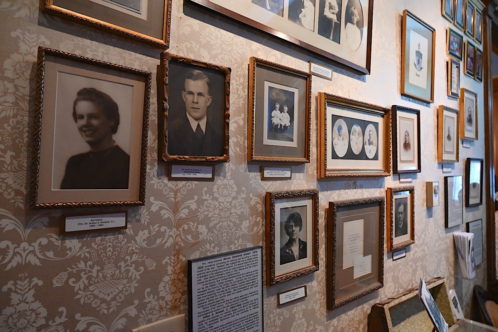 In a first-floor hallway of Kimball House are photos and portraits of members of the Kimball family.