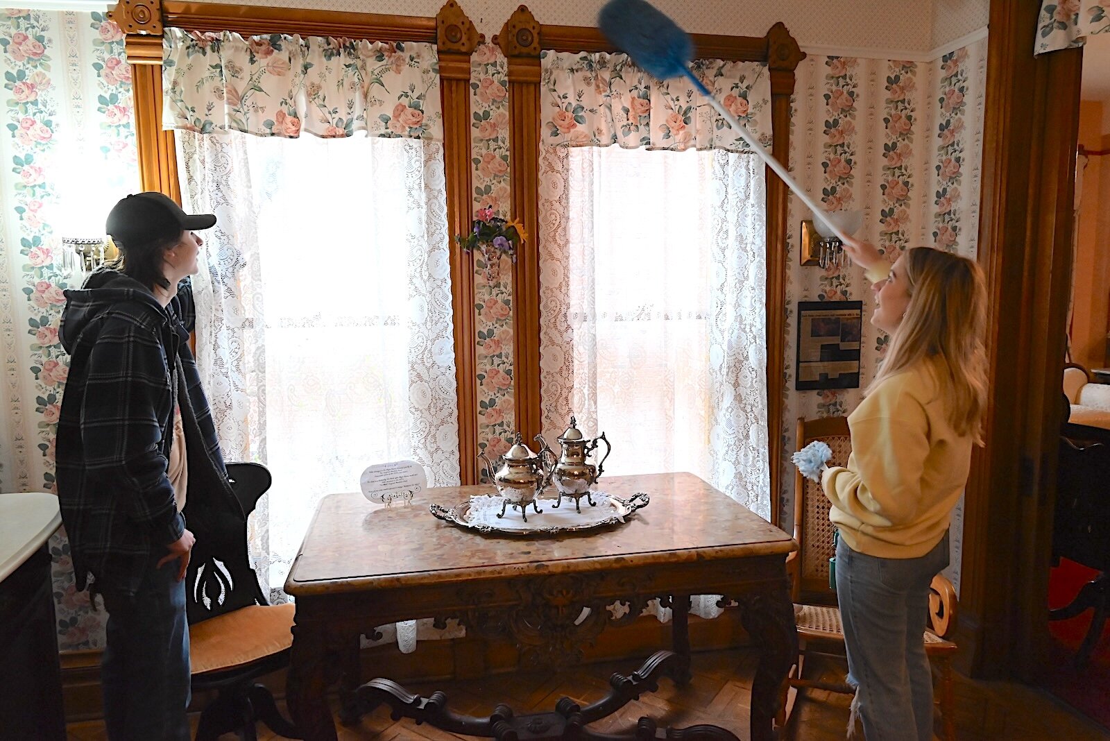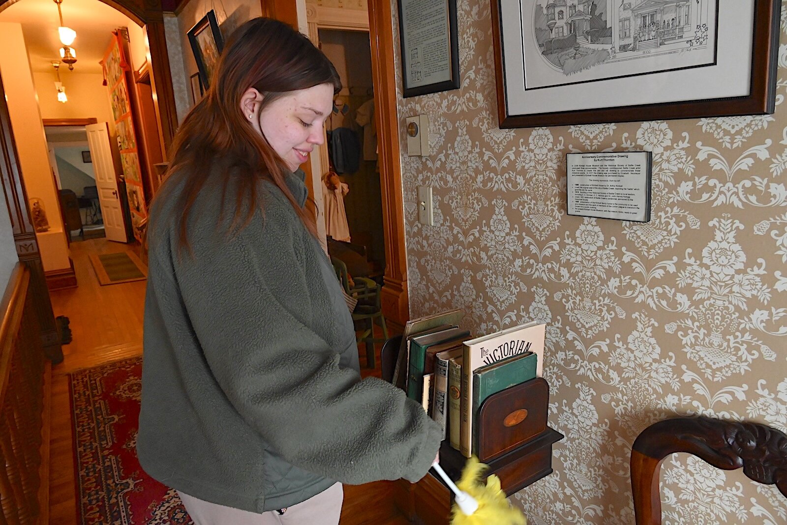 Samantha Harris, a Kellogg Community College student, dusts items on the second floor inside Kimball House.