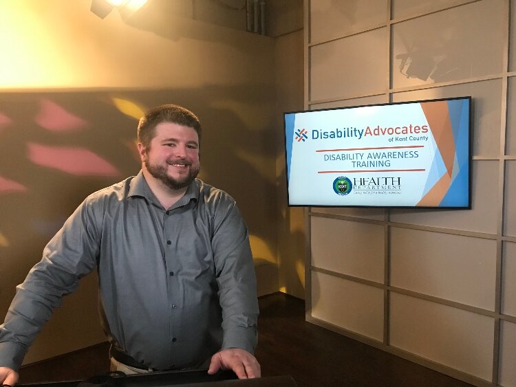 Jon Cauchi is a DEIA speaker for speaker for Disability Advocates of Kent County. In the photo, Jon Cauchi, who has a beard and is wearing a gray shirt, is standing in front of monitor advertising disability awareness training.