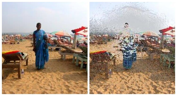 Jon Cauchi uses these images to illustrate vision impairment, a term he prefers to describe his disability instead of visually impaired. The left image shows a woman on a beach. In the second image, the woman is nearly whited out.