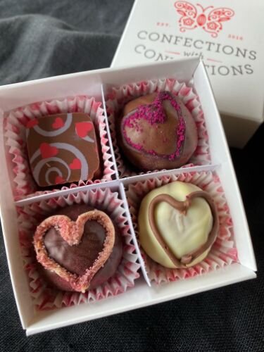 The operator of Confections with Convictions smiles as he shows the small but lush candy and three others that he and his staff created after researching ingredients believed to promote passion — just in time for Valentine’s Day.