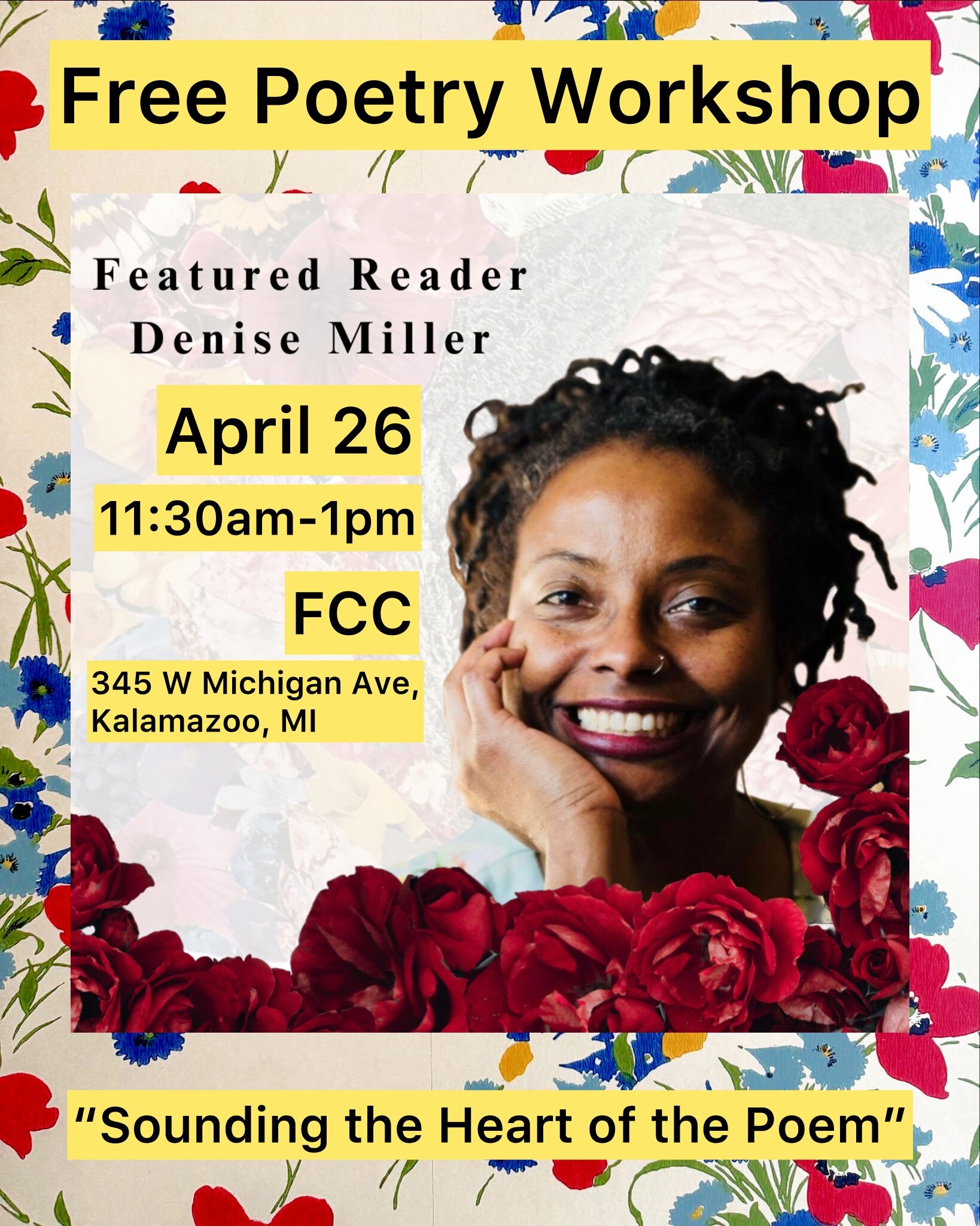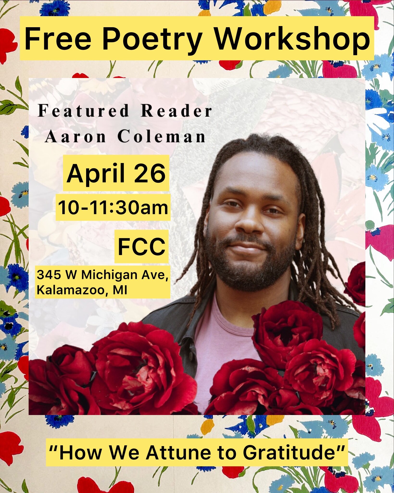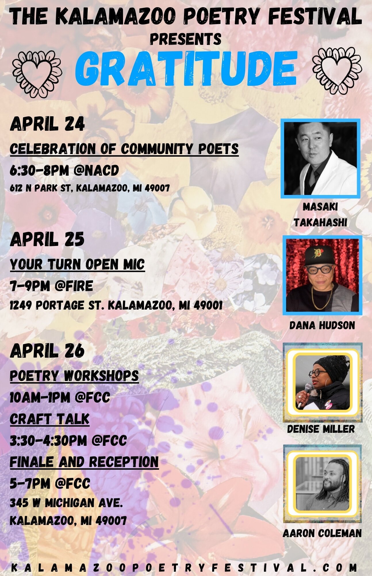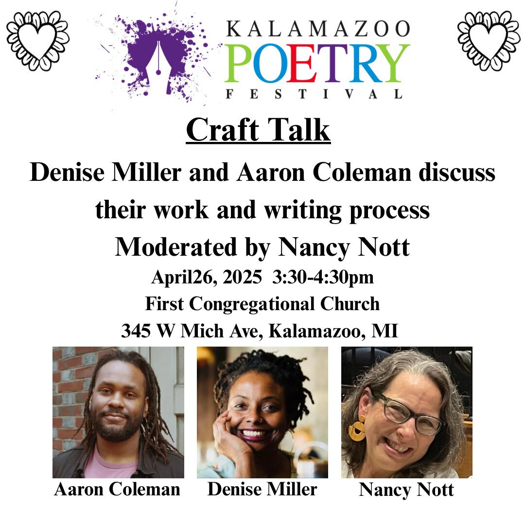 The festival culminates in two poetry workshops featuring the theme, Gratitude, one facilitated by Denise Miller and the other facilitated by Aaron Coleman from 10 a.m. to 1 p.m.; a Craft Talk with Miller and Coleman from 3:30 to 4:30 p.m.; and the festival finale and reception from 5 to 7 p.m. Saturday’s events all take place at First Congregational Church, 345 W. Michigan Ave.