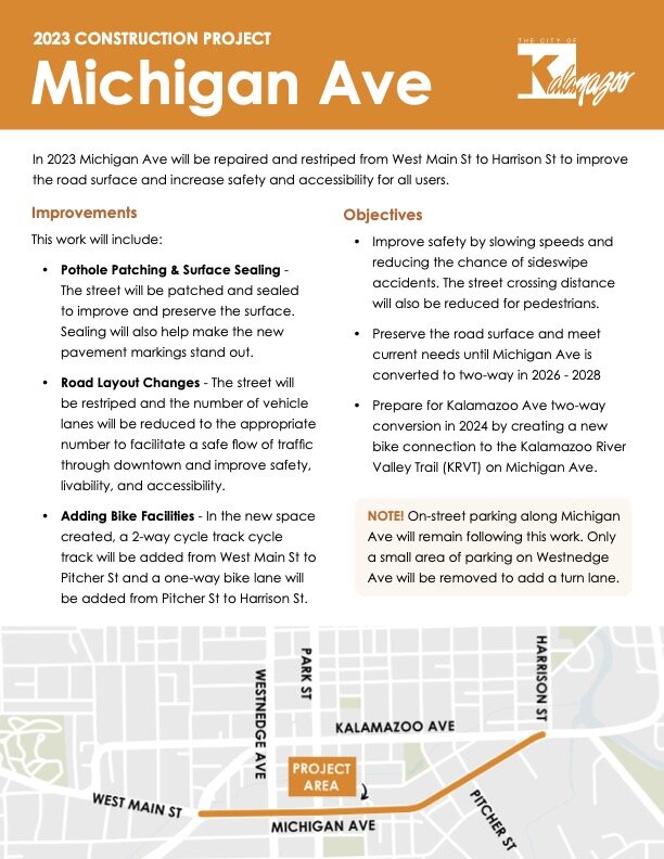 In late summer, Michigan Avenue will be three lanes, with parking on both sides, and a bike track between the parking lane and sidewalks on the south side. The changes will begin where Stadium Drive connects with West Main and Michigan, and continue to Harrison Street where Michigan connects with Kalamazoo Avenue.