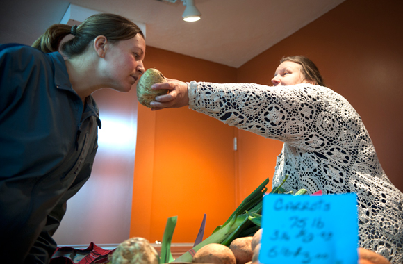Greeting customers at the door and standing guard at the coffee pot, keeping it ever hot and full, is Damon Geary. Damon and brother Kavan started the indoor winter market in 2010 and are happy to see word spread in its second year.