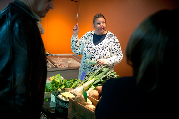 At the very center of the market, also never sitting down, are Mitch and Lindsay Visser of Visser Farms. Along their large rectangle of tables is the season’s last bright garden produce, adding green to the winter landscape. In colorful stacks and pyramids are, yes, tomatoes, the fruit of summer, and celery, onions, potatoes, squash, parsnips, apples, kale, sweet potatoes, turnips, and boxes of farm-fresh eggs.
