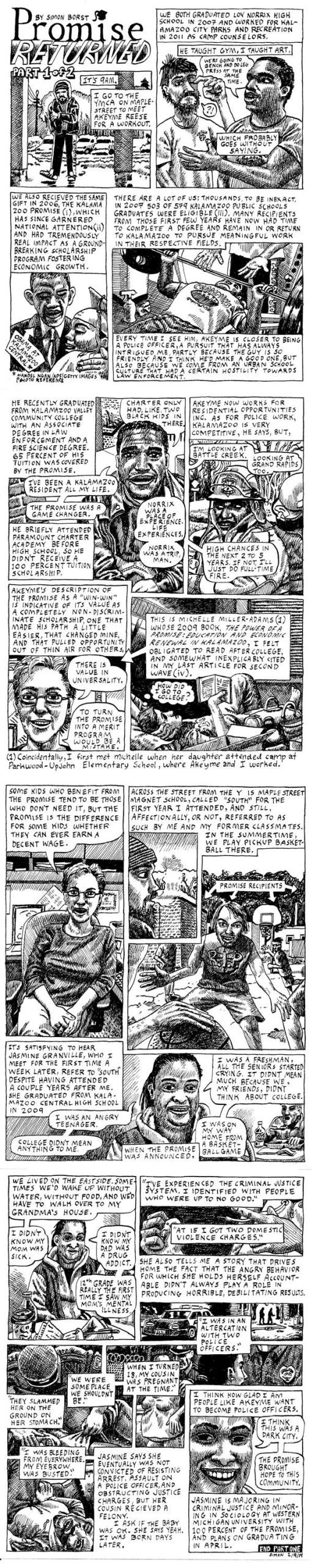 Graduating in 2007, Simon Borst was part of the second class to receive the Kalamazoo Promise, a scholarship that covered up to 100 percent tuition at any Michigan public university or college for those who attended Kalamazoo Public Schools. Now Borst is among those who have returned to Kalamazoo. The artist tells their story in a graphic news form. This is the first of a two-part series.