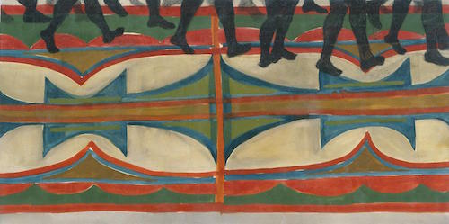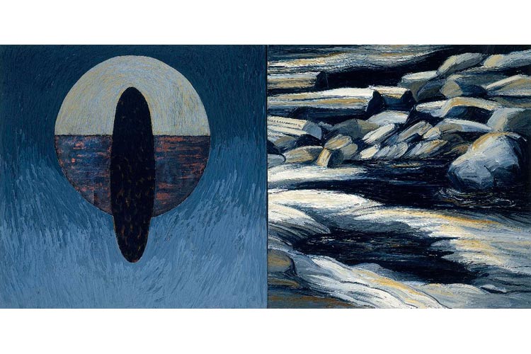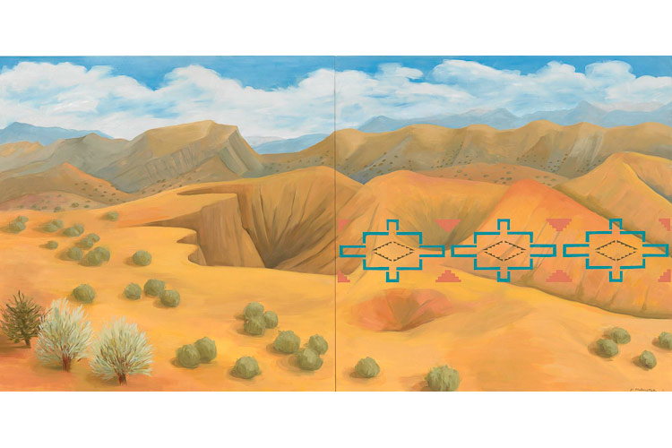 “And what I wanted to do was make some paintings about what I saw, as well as what I thought about what I saw, and that’s when the diptychs came in.” She would merge two panels, one side landscape, the other an abstraction or a land overlaid with Native American patterns or themes.