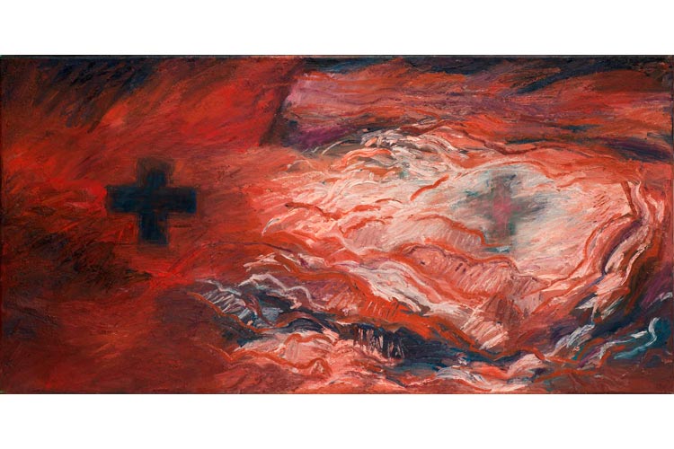 “The paintings themselves evoke a mood, an emotion, a response to a place, or an idea, or a concept, so that it is not just a picture of a place or a concept or a thing, but I would hope a somewhat more complex level of response. Many of them, the texture of the thing itself, the texture of the painting, is a part of the whole experience (for the viewer). Especially the earlier ones.” They’re thick, layered, “you can see through the layers into other things.” Some are impressively large, others the size of a book, to be studied. One can’t just look up a digital image of her paintings on the web, she says. “They do have to be experienced.”