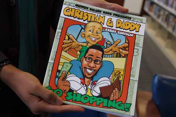 Steppes has written a children’s book called Christian and Daddy Go Shopping, edited by Sonya Bernard-Hollins and brightly illustrated by Kenjji Jumanne-Marshall (who goes simply by Kenjji). Along with the book, Steppes sells colorful lunch sacks, T-shirts, greeting cards, a music CD, and kid-size wrist bands that read: “I am money smart.”