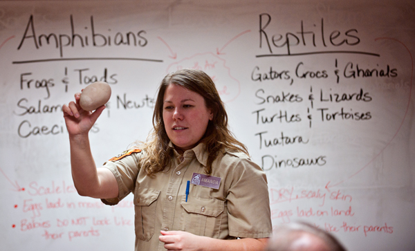 At a two-hour session on amphibians and reptiles in late March, a bloated-looking toad named Dorado squeaked as zoo educator Amanda Bailiff held him up in front of a room full of 19 children and the 20 or so adults with them.
