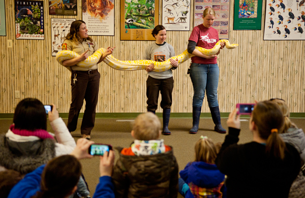 At the Conservation Discovery Center, Bailiff needed the help of two other zoo staffers to hold up a 10-foot-long, 80-pound Burmese python named Sierra. Her yellow color, Bailiff explained, is not the normal color of this type of snake, but Sierra is an albino and has pink eyes.