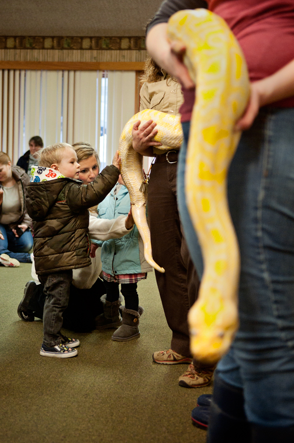 As Bailiff told the children they would have a chance to touch Sierra but needed to stay away from her head, the snake wound its tail around the back of Bailiff’s leg. “They can bite,” Bailiff said, “but she doesn’t usually try. She’s a nice snake.” Just then, as if to make her a liar, Sierra wound her tail between Bailiff’s legs and up toward her waist. The adults laughed. “Never a dull day at the zoo,” said Bailiff, blushing.