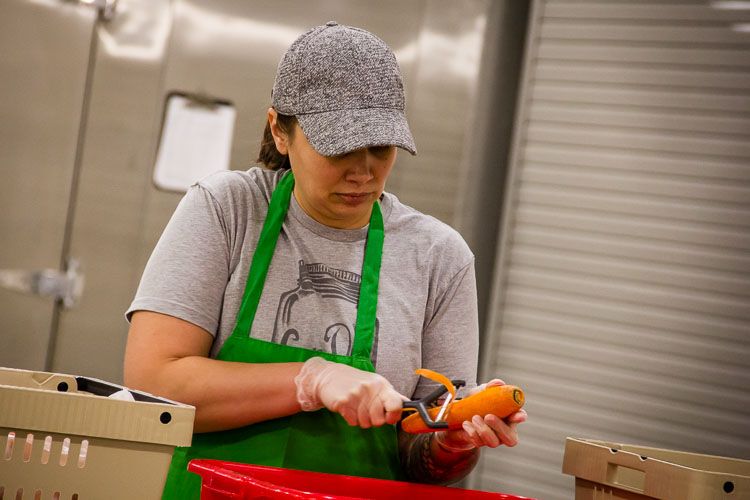 At ValleyHUB, workers clean, peel, slice, and clean again locally-grown onions, carrots, turnips while alternative hip-hop plays from a small speaker. This is called “light processing,” and here there is a purpose-built food processing space.