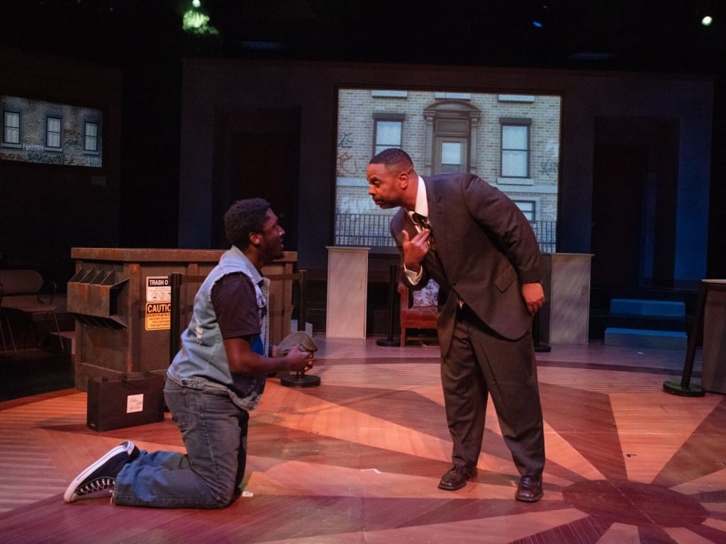 In another museum exhibit, “Symbiosis,” a man (Julian S. Newman) in a conservative suit, with conservative hair, speaking stiffly and “correct,” is tossing items representing his past into a dumpster, while his past self (Delanti Hall) grieves and wails.