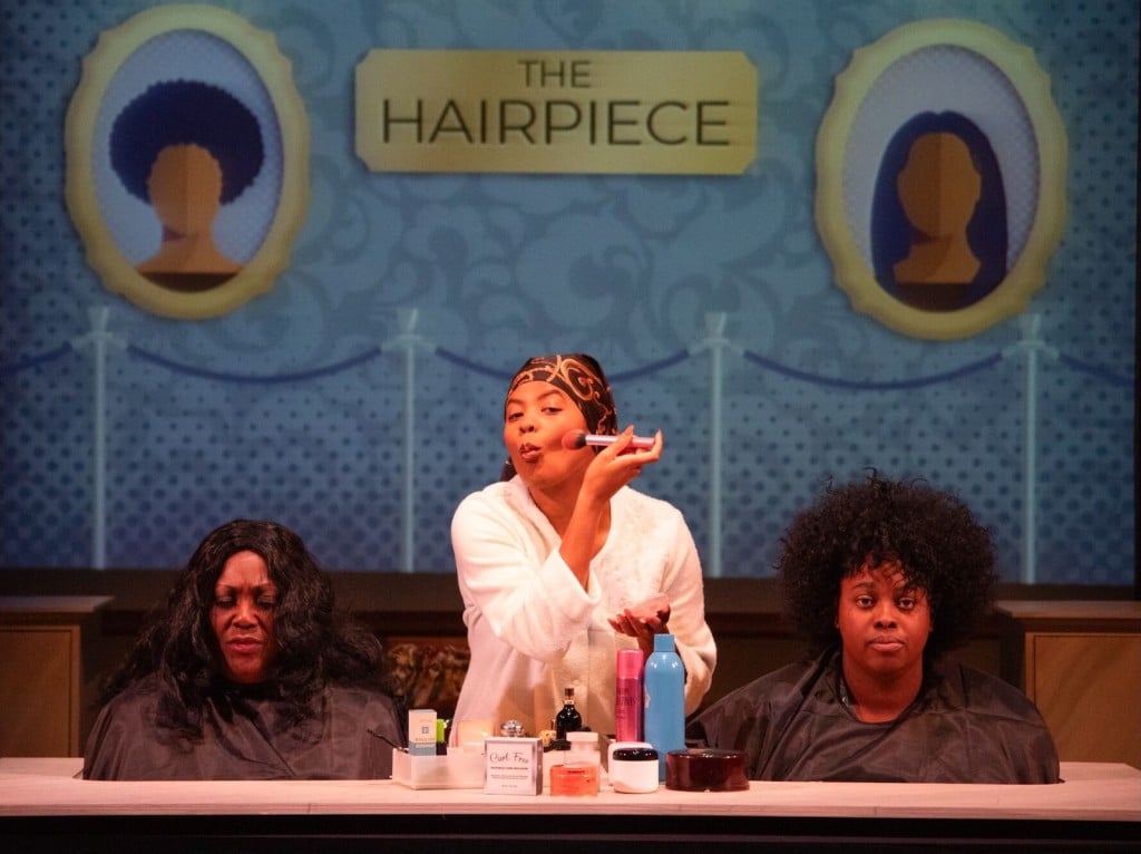 “The Hairpiece” had two wigs (Hart and Milan Levy) come to life. One kinky hair, one straight, they argue with each other and with the woman (Laney) who’ll choose which to wear for the evening.