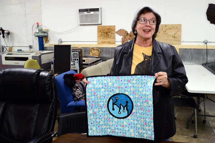 Next door is the crafting zone, where fiber arts such as quilting are practiced. Stacy Belinsky drops her experiment making snowflakes with a glue gun and nail polish to show what a square of quilt art on the wall can do. She manipulates it, and various lights shine.