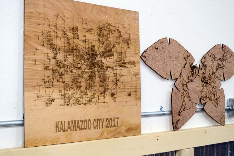Czarnik, who specialized in sheet metal while serving in the Air Force, is at the space “just trying to expand my skill sets and build ridiculous things.” Next to the shell he’s got a large wooden sword out of a fantasy cartoon. Near the large expensive laser etcher are maps of Kalamazoo and polygonal globes Czarnik burned in wood.