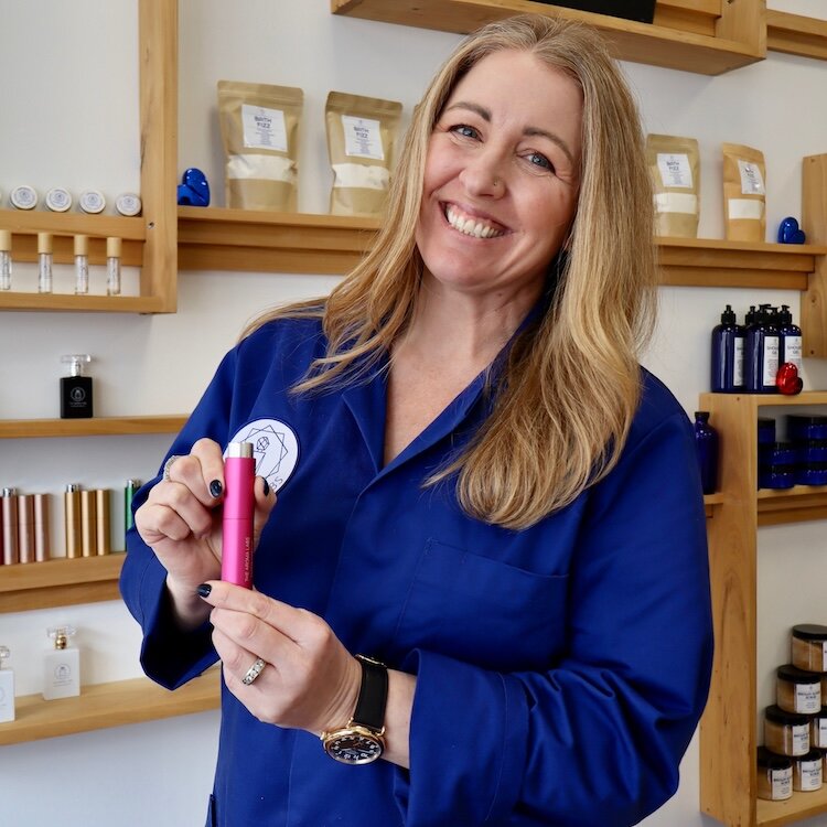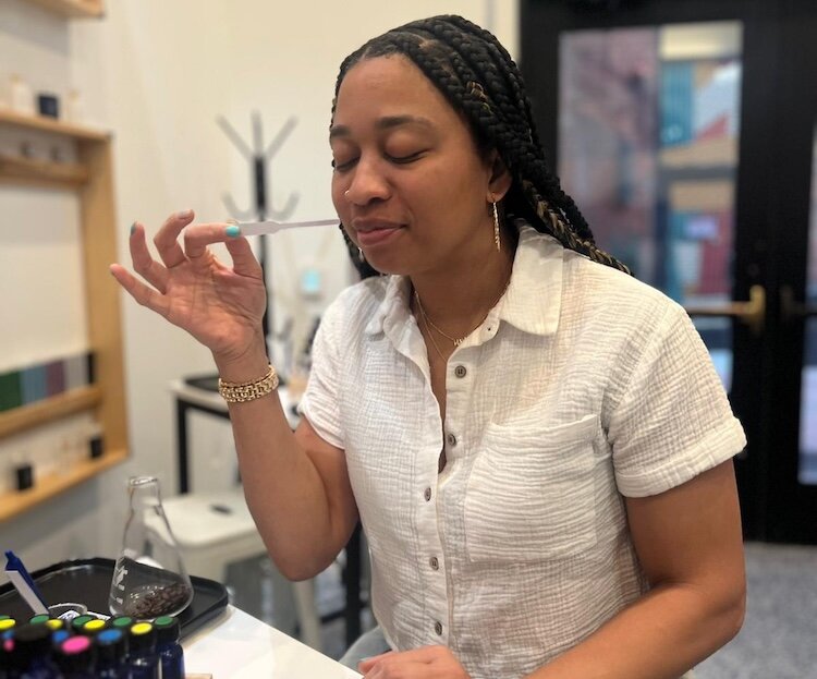 A woman checks some of the 40 unique fragrance oils that can be mixed and matched at The Aroma Labs. They include bright florals, juicy citruses, cozy spices, and deep, woody scents.