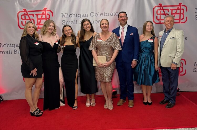 Tanya Thompson, center, is joined by family members and friends in April of 2025 in East Lansing after being named one of the top Women-owned Small Businesses of the Year by the Michigan Small Business Administration. See list of names below story.