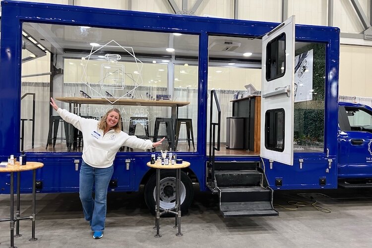 Tanya Thompson stands outside of “Big Blue,” The Aroma Labs’ large Ford F-550 mobile experience.