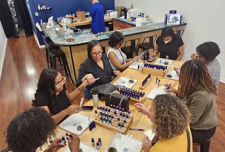 A group of women create their own fragrances inside The Aroma Labs location at 352 S. Kalamazoo Mall in downtown Kalamazoo.