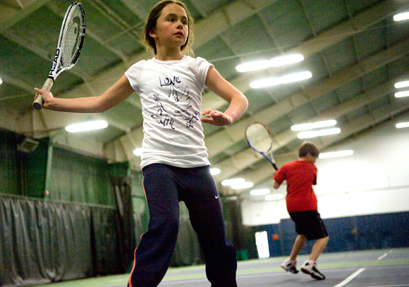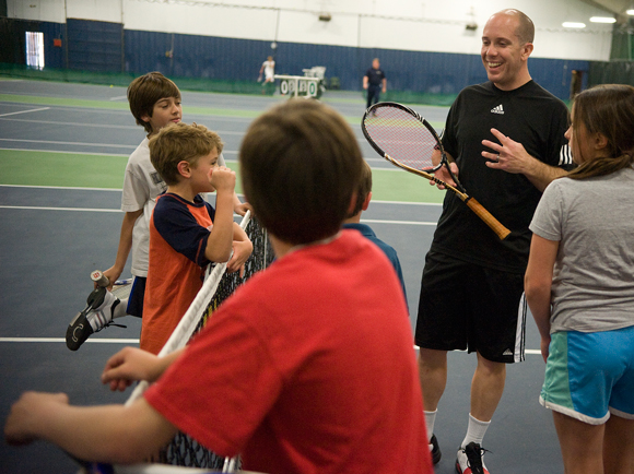 YMCA tennis coach Matt Olsen works with kids during their lesson at teh Maple Street YMCA.