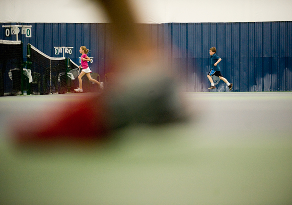 Olivia Oosterbaan, left, and Cougar Wootton warm up for tennis lessons with a jog around the courts at the Maple Street YMCA in Kalamazoo, Mich.