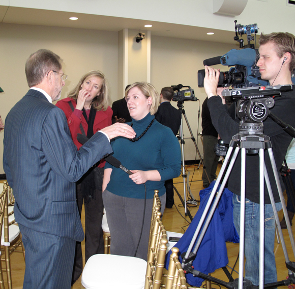 Reporter Paula Davis talks with Paule Spaude of Borgess and Frank Sardone of Bronson, the CEOs of the two hospitals that are partners with WMU in the medical school. Photo by Kathy Jennings