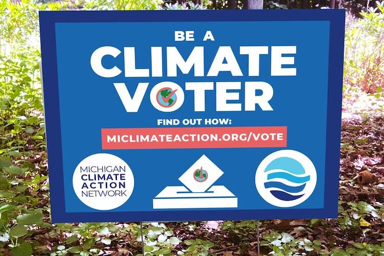 Michigan Climate Action Network is one among many local, statewide, and national organizations that offer Climate Voter signs. Many of the signs include logos or QR codes linking to local climate advocacy groups.