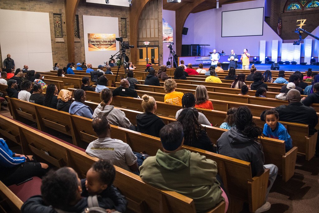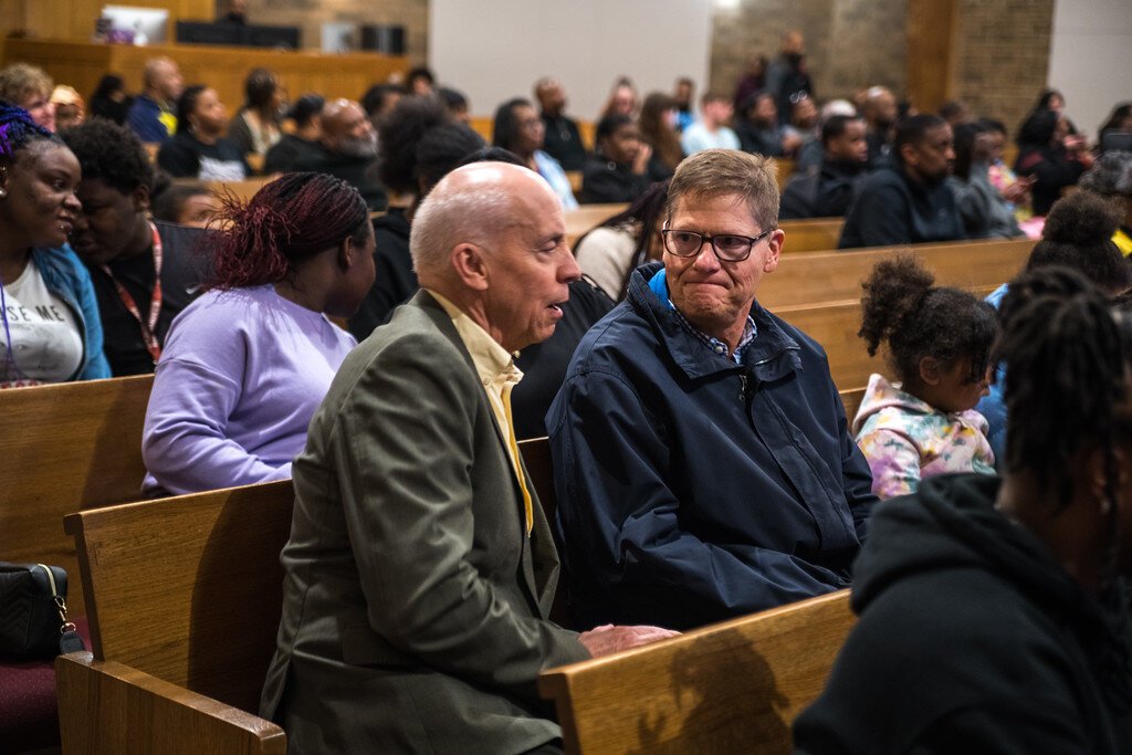 Kalamazoo Mayor David Anderson, center left, and City Manager James Ritsema, talk in the pews of Mount Zion Baptist Church before Wednesday’s anti-gun violence walk in Kalamazoo.
