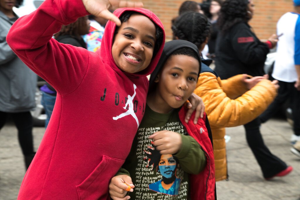 Two children smile and make faces as they participate in the Wednesday, April 30, 2025 Dominion Walk against gun violence.
