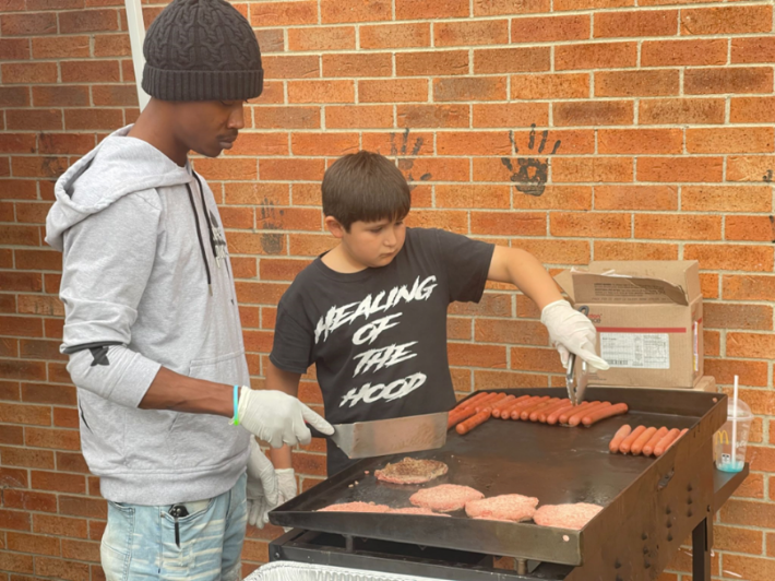 Montine “Mikey” Wiley jr., left, helps a youngster learn to cook.