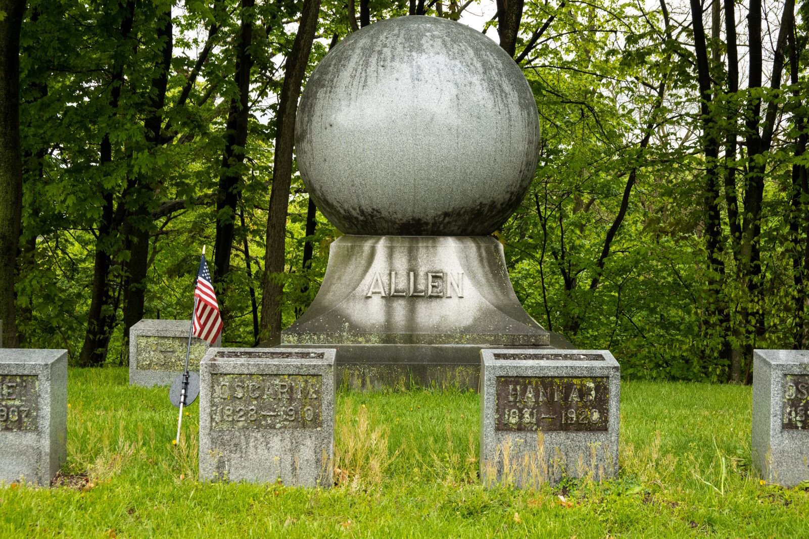 “The globe, to me, has significance,” Houghton says, pointing to a boulder-sized orb on a plot of land near the eastern edge of the cemetery. It is the family burial place of the Allen family.