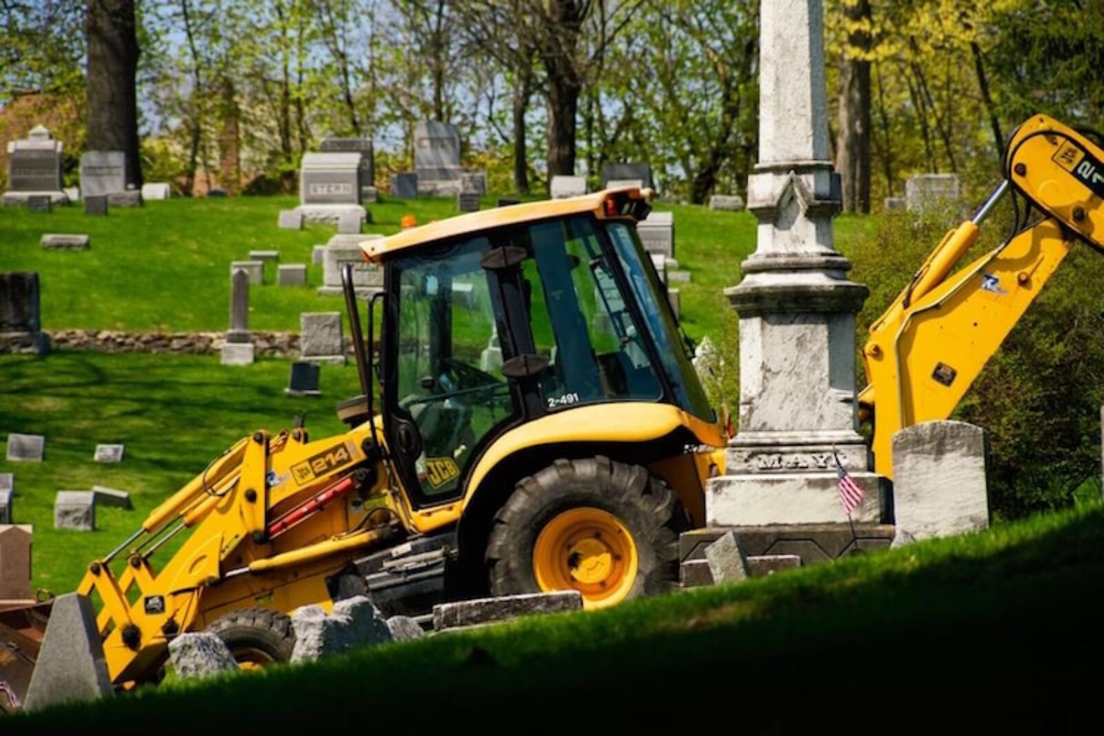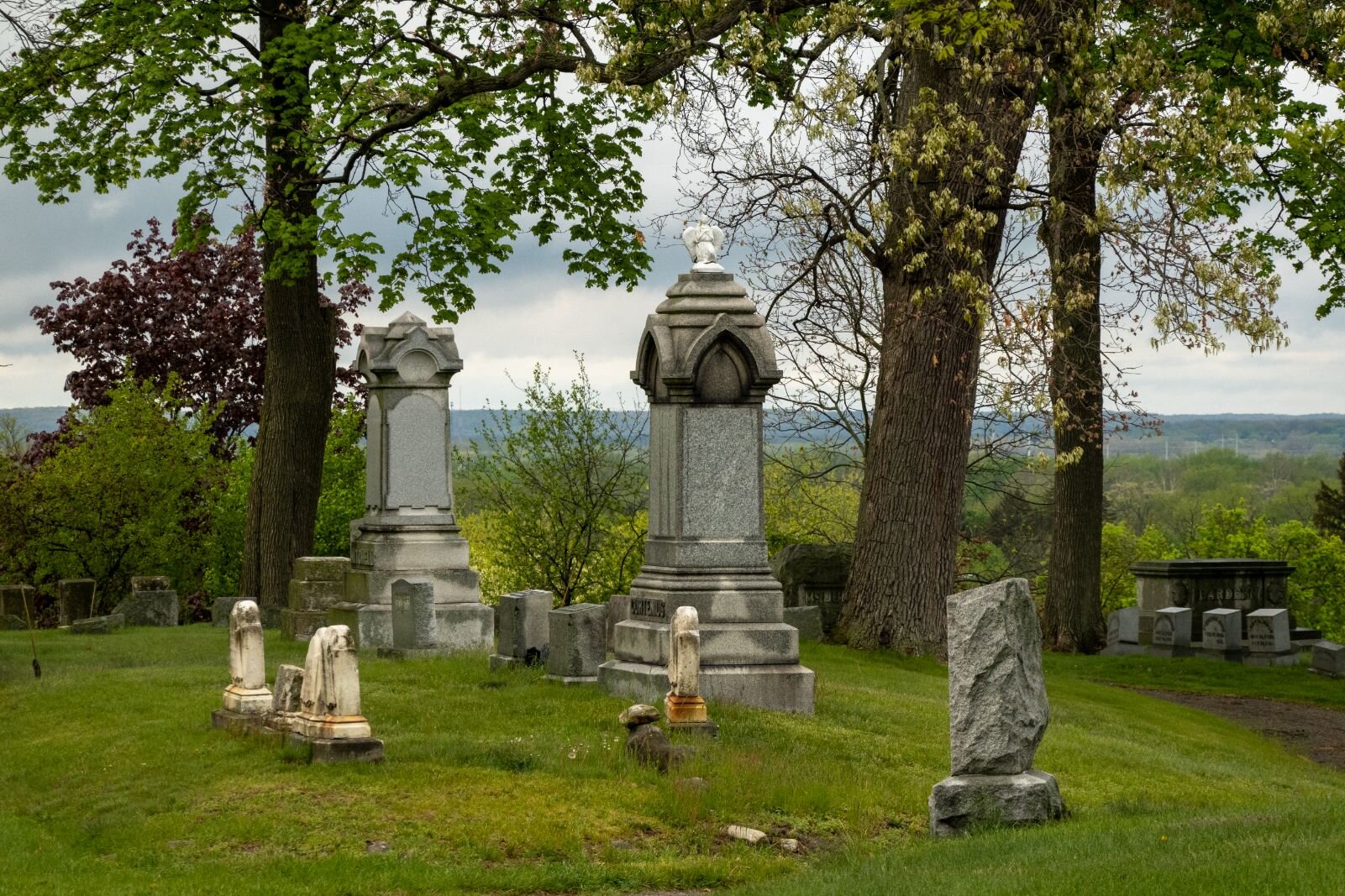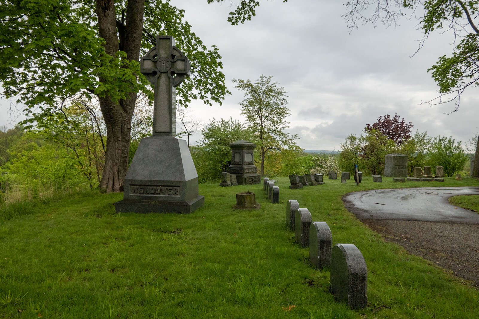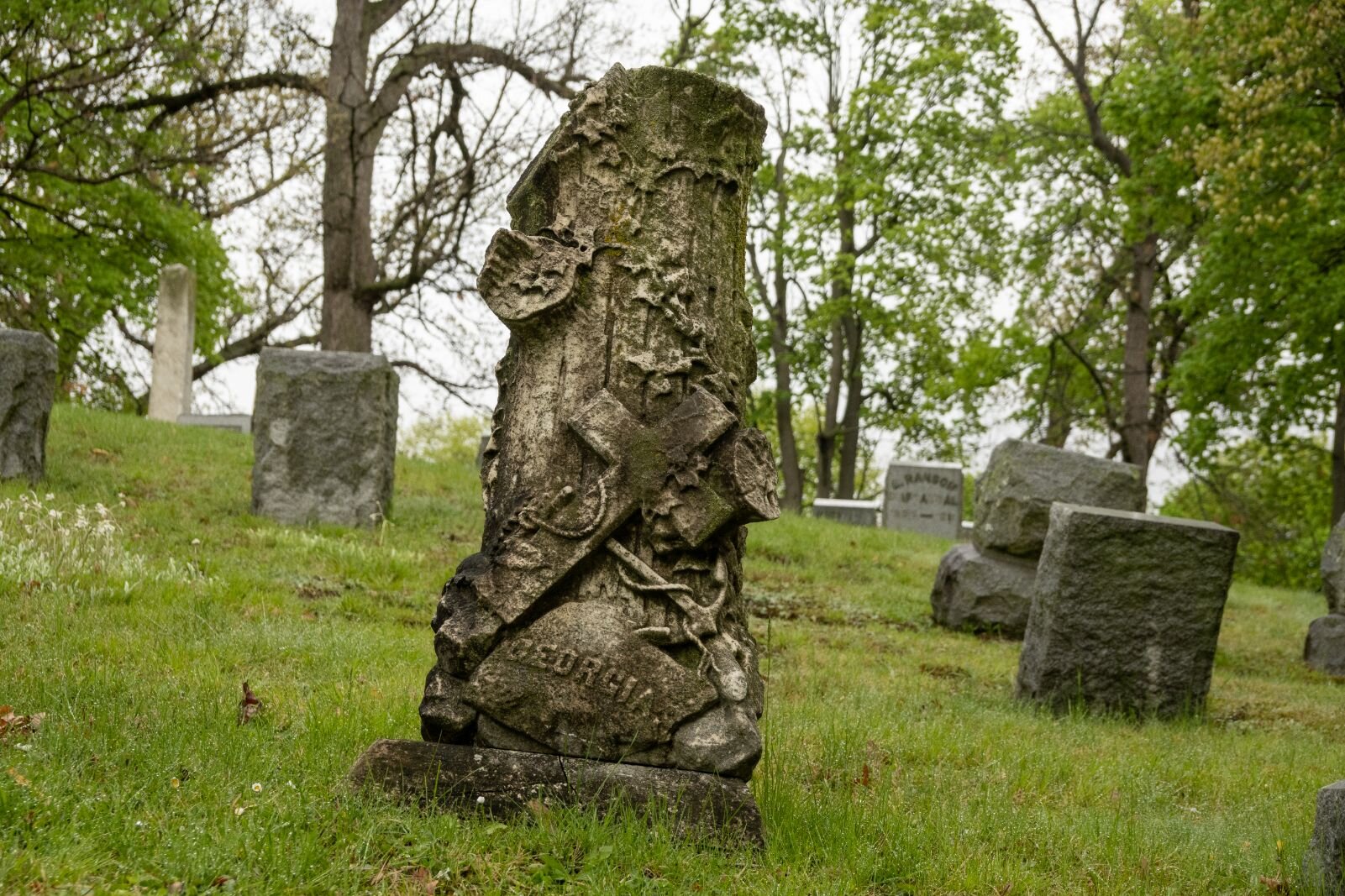 The terrain is picturesque but presents some problems with maintenance. And vandals have, over the years, overturned some older gravestones.