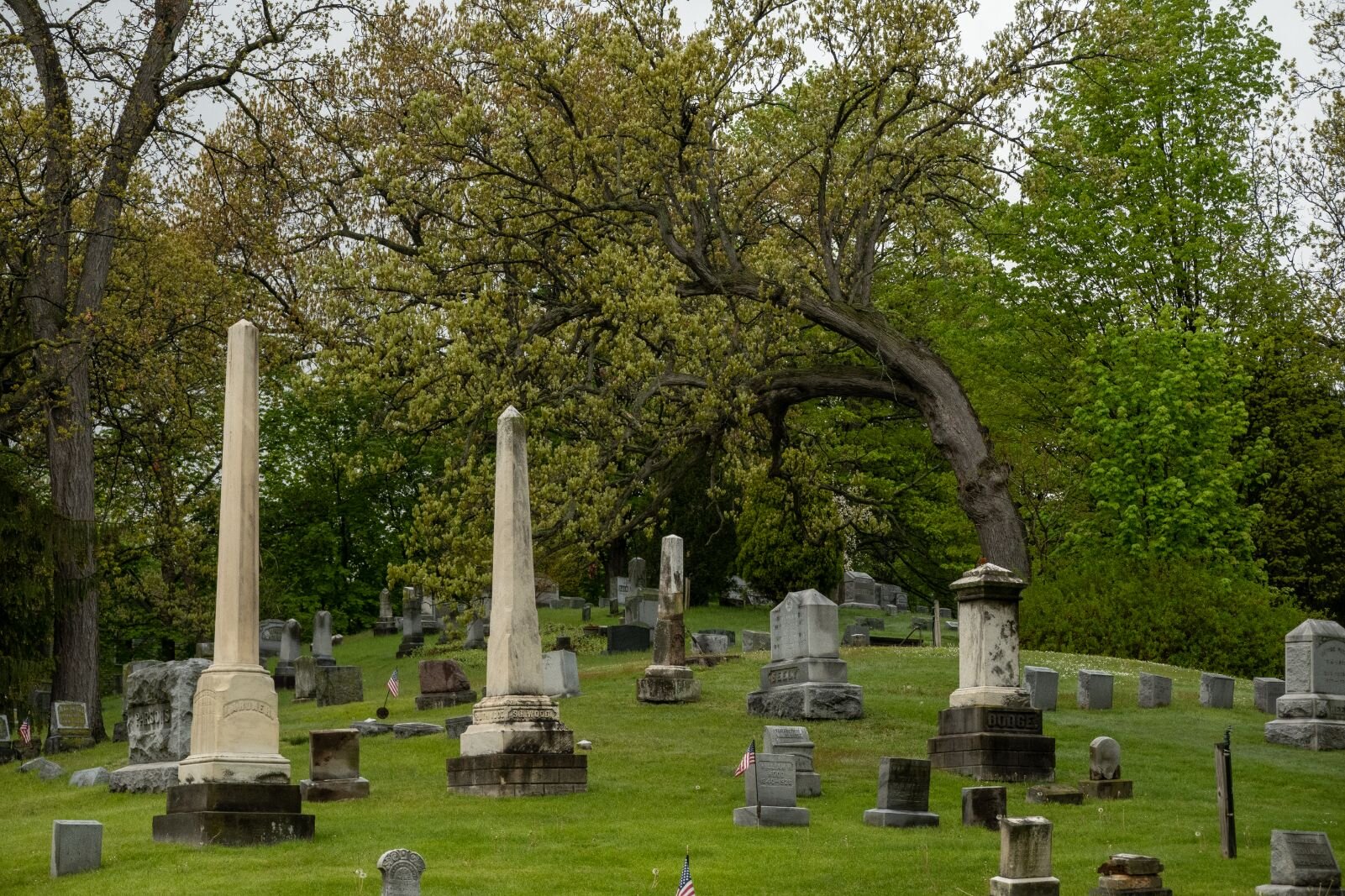 The cemetery was organized in 1849, about 18 years after the city of Kalamazoo was founded, on land whose dips and turns would have made farming difficult. Houghton says the first burials were probably done in 1850.