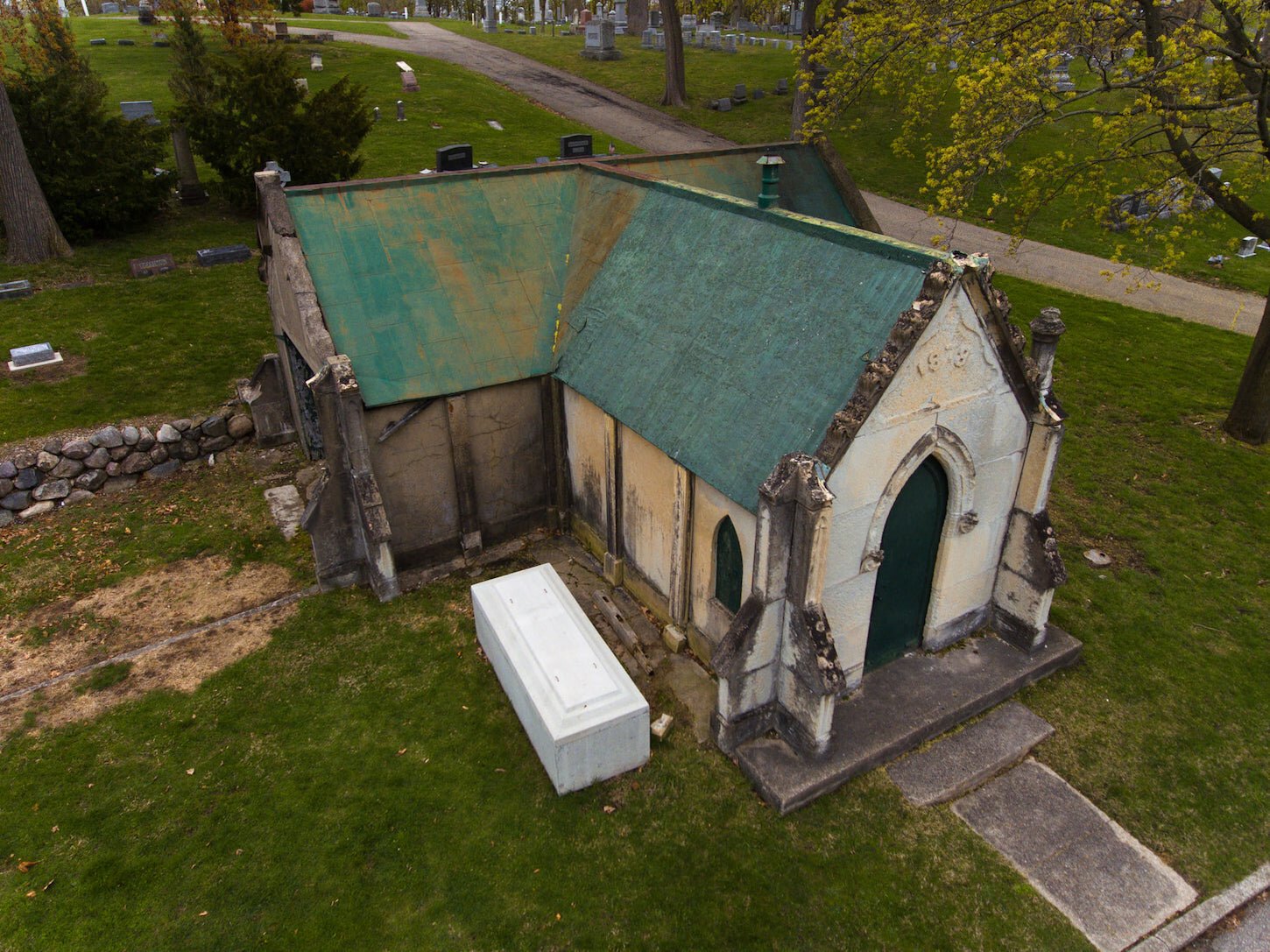 Funding is being provided by the Irving S. Gilmore Foundation to improve water drainage from the area and to do such things as rebuild stone walls and structures that have deteriorated or been damaged over the years. A $687,820 grant from the foundation is expected to help cover costs to repair roadways and storm infrastructure inside the cemetery as well as perform forestry work and restore structures such as retaining walls, stairways, and catch basins.