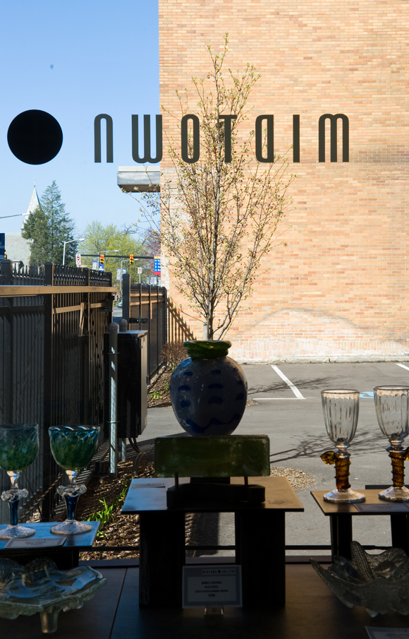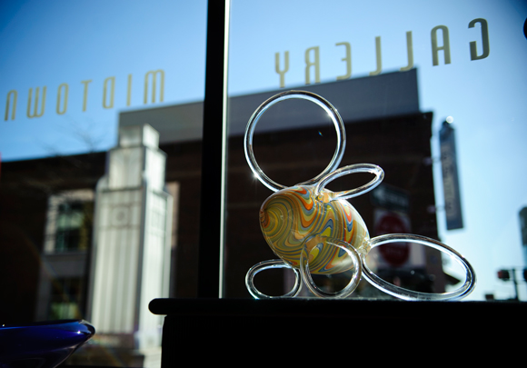 Dazzling sunlight glints of a piece of glass art by Taylor Kurrie called Homegrown Play that is on display in the front window of Midtown Gallery.