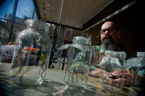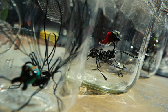 The gallery is celebrating Michigan Glass Month with a selection of exhibits from artists in the state. Jessica Bohus created a selection Bugs In Jars.