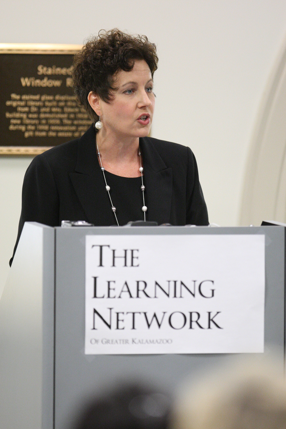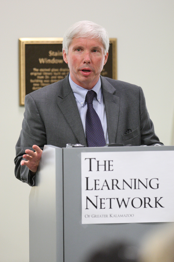 Members of the Learning Network gathered in a press conference at the Kalamazoo Public Library before more than 200 people to discuss the initiative. They emphasized that much of what needs to be done builds on what has already been accomplished in the town that is becoming known for The Kalamazoo Promise — a scholarship program that pays college tuition and fees for all graduates of Kalamazoo Public Schools who go on to Michigan public colleges or universities.