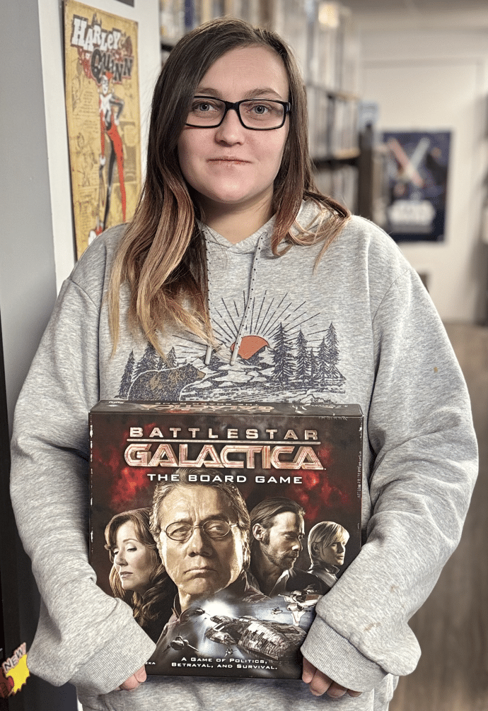 Natalia Voss, an employee at Voss Media Board Game café in Galesburg, holds the box for “Battlestar Galactica: The Board Game.”