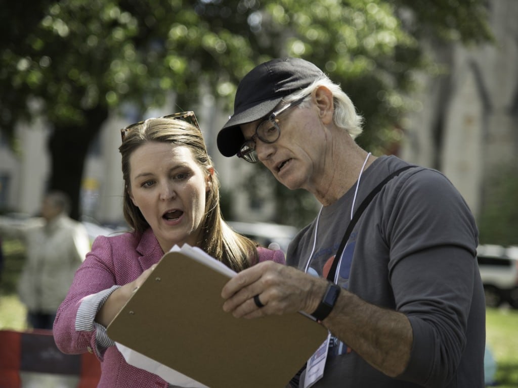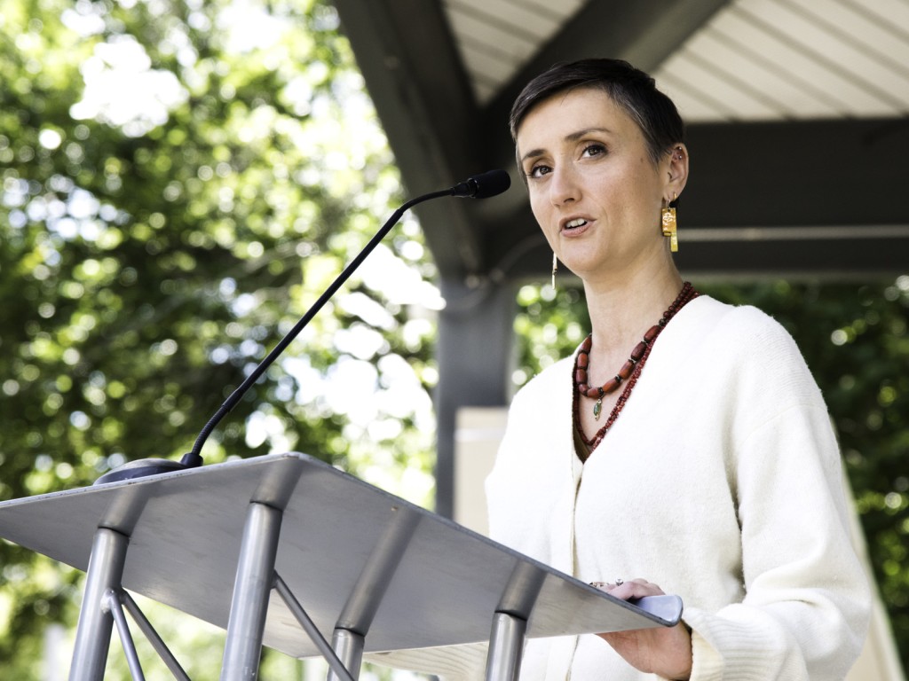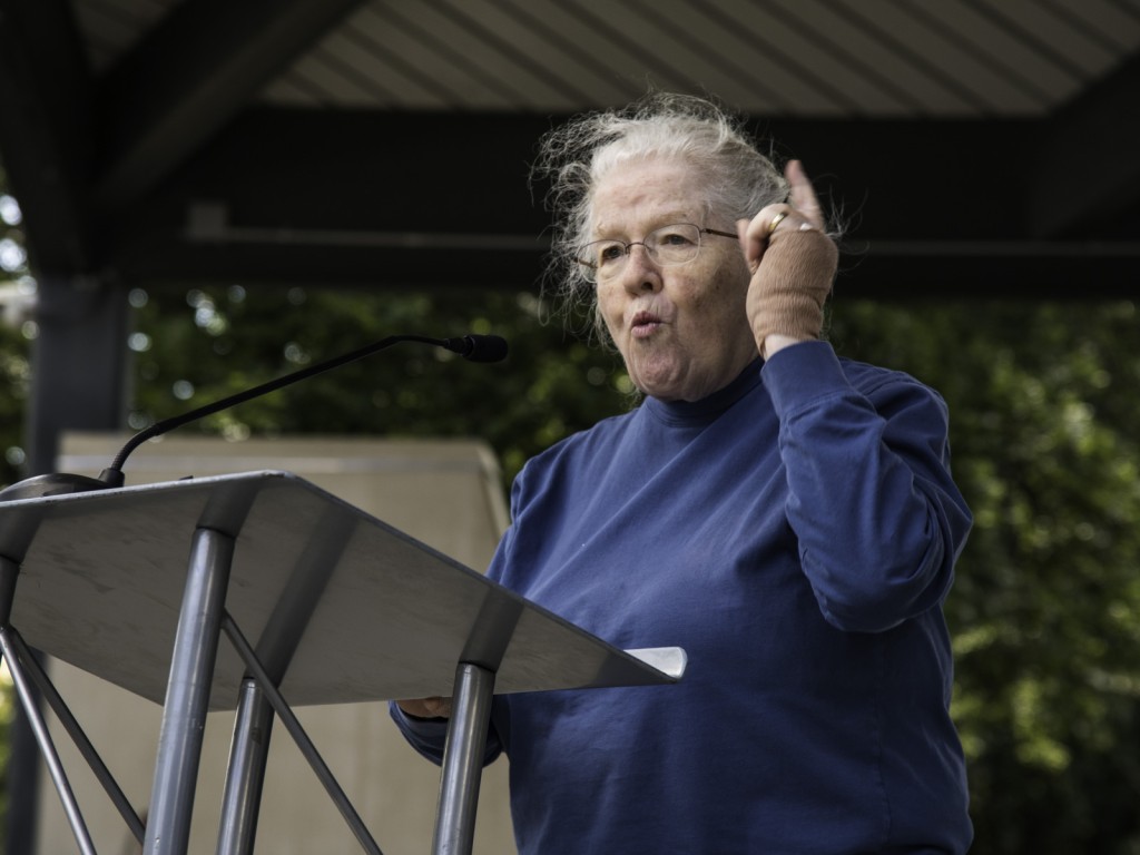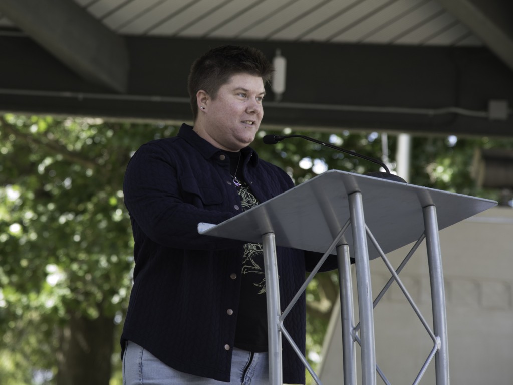 County Clerk Place spoke to the crowd to assure that, locally, “our elections are strong, secure, and trustworthy.” She asked the public to help keep them that way. “The strength of our democracy doesn’t just rest in offices like mine. It rests in you,” she says, asking for citizens to sign up to be election inspectors, “Republicans, Democrats, and independents working side by side.”
