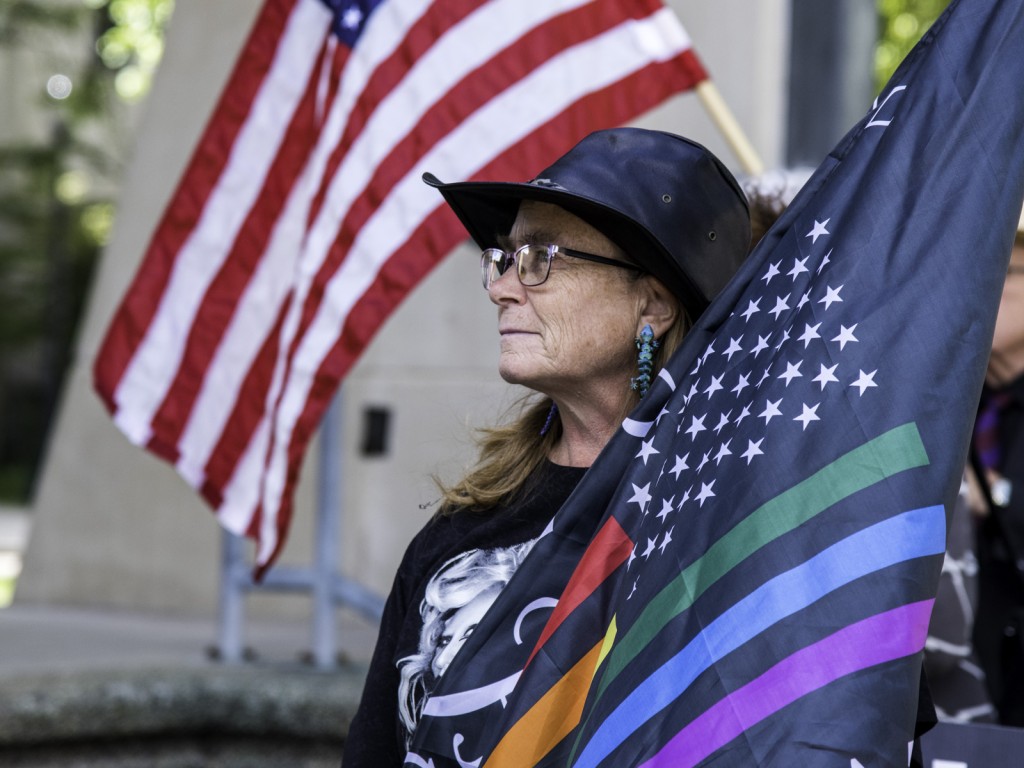 People in the park were fired up. There were some protest signs, American flags, peace symbols, and LGBTQ+ rainbows. But most in the audience were there to sit and listen, rather than demonstrate.