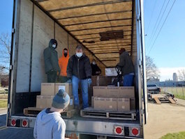 Community comes together to distribute 40,000 pounds of food and 1,200 initial PPE Resource Kits to distribute to Battle Creek residents.