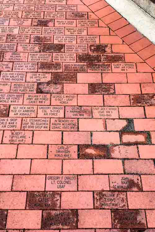 Family and friends of veterans have purchased 2,281 brick pavers to memorialize individual veterans since it was dedicated Veterans Day, November 11, 2001. The bricks typically contain the veteran’s name, branch of service, rank, and dates of service.