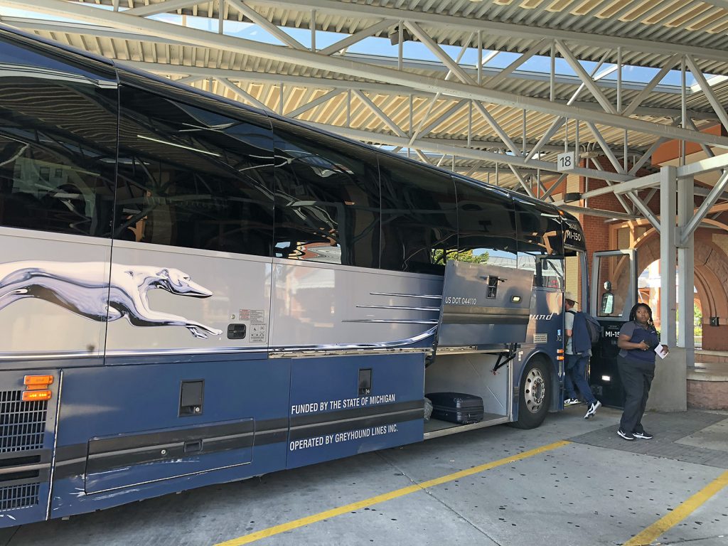 Unhoused people relocating from Kalamazoo travel by bus. Here a bus driver checks in passengers at the Kalamazoo Transportation Center. Photo by Mike Wenninger