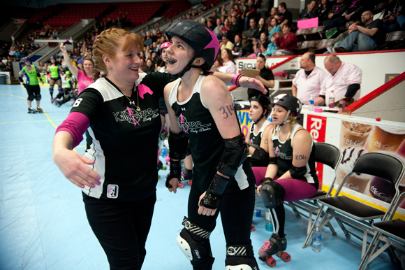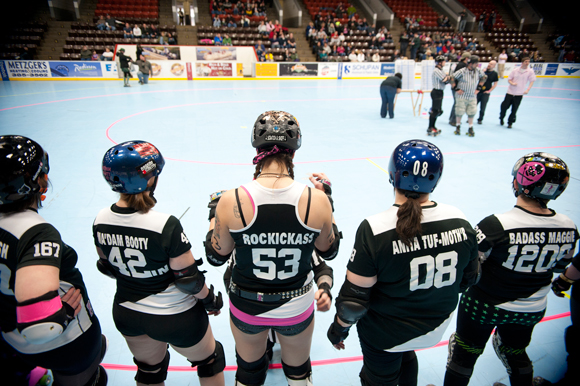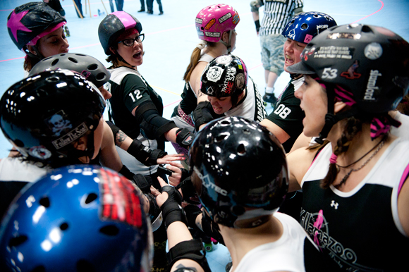 In keeping with their often rough and tough derby persona and colorful derby names, the women who make up the Derby Darlins focus on giving their all at every bout.